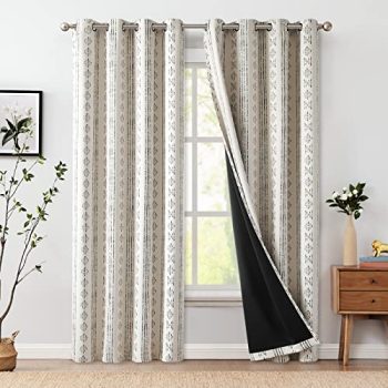Geometric Semi-Blackout Window Curtains 2 Panels Boho Linen Room Darkening Curtains Tassels Rod Pocket Window Drapes for Bedroom Living Room(52\” W x 63\” L Pair, Cream)